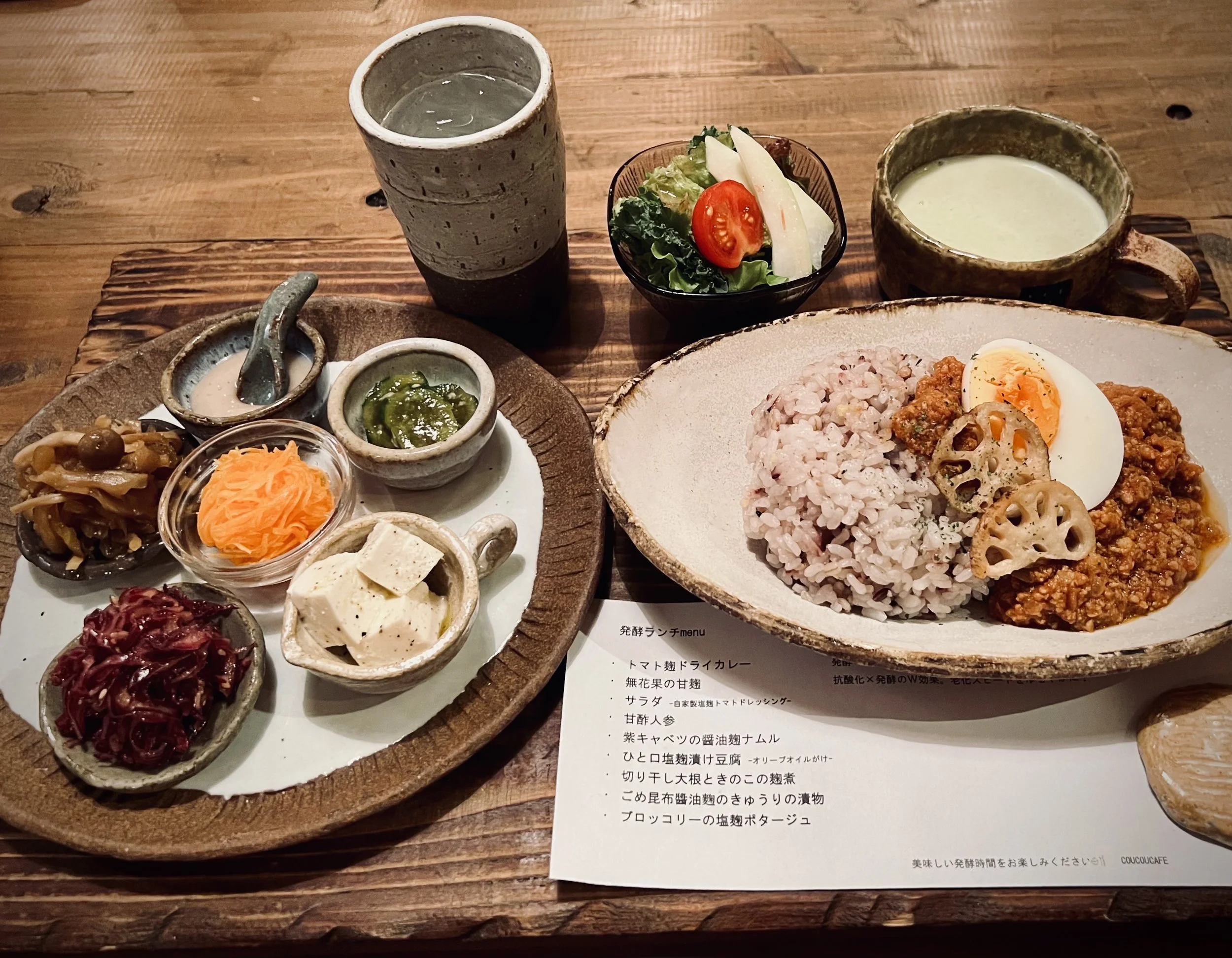 オーナーが提案し制作した手焼き小皿が並び、色とりどりの発酵メニューが美しく盛りつけられていた。
